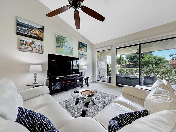 An updated Energy Efficient Sunrise Country Club Barcelona Model with Renova Solar Energy panels which are owned. Sunscreens, modern misting system at back patio, Electric Port for Hybrid car in garage. Newer stainless steel appliances with open kitchen concept and Quartz counter, artwork, remote custom shades, plantation shutters, updated electric and plumbing, desert blooming landscape with new irrigation, golf cart included as well. Make this home a wise choice for your primary residence, second home or even a rental investment property. Offered turn-key furnished for immediate occupancy. Sunrise Country Club Residents have access to the Clubhouse which includes a Dining Room, Bar & Lounge and Grill. Amenities also include an 18 Hole Golf Course, Tennis, Pickle Ball and Fitness Center. Situated in the heart of Rancho Mirage close to Theaters, Shopping and Fine Dining.