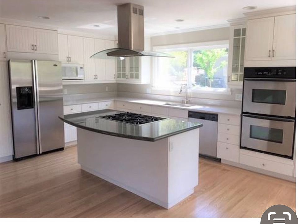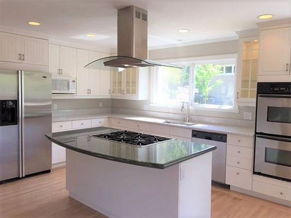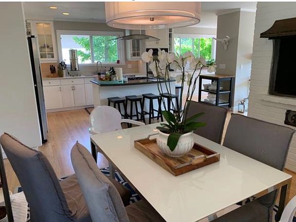 The home is appointed with a gorgeous open concept chef's kitchen, complete with a wine fridge, double ovens, and Wolf commercial six burner range located in a large center island, situated ideally for participation in entertaining and/or family evenings of homework and at home meals. The house has three fireplaces located in the living room, dining room, and downstairs bedroom. The floors were recently refinished and are now walnut in color.
