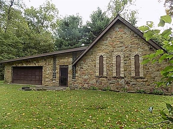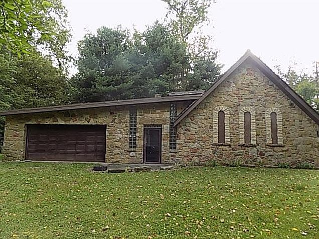 Unique Stone home with a large two car detached garage . Located on a private , level lot of 1.8 acres. Two stone fireplaces, one in living room one in the second bedroom located upstairs . First floor master and a first floor full bath