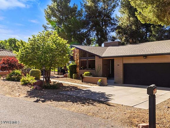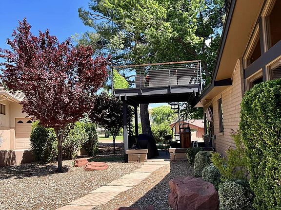 Beautiful home in a park-like setting with mature trees and golf course views. Located on a quiet cul-de-sac. Cathedral ceiling with large picture window views of Castlerock. Home has a cozy feel with wood burning fireplace and rustic barn doors. Enjoy coffee on the large composite deck or up the spiral staircase to the treehouse feel of the observation deck. Enjoy 360 views of surrounding red rocks and starry night sky. Primary bedroom includes slider to deck and a spa like bathroom with jacuzzi tub. Large walk in closet. Brand new warranted roof (4/24), fresh paint, new front room window shades, 8X12 new storage shed. Close to hiking trails, dining, Clarkes market. Easy to get to the I-17 from VOC. Many artistic touches throughout. **Owner/Agent**