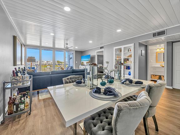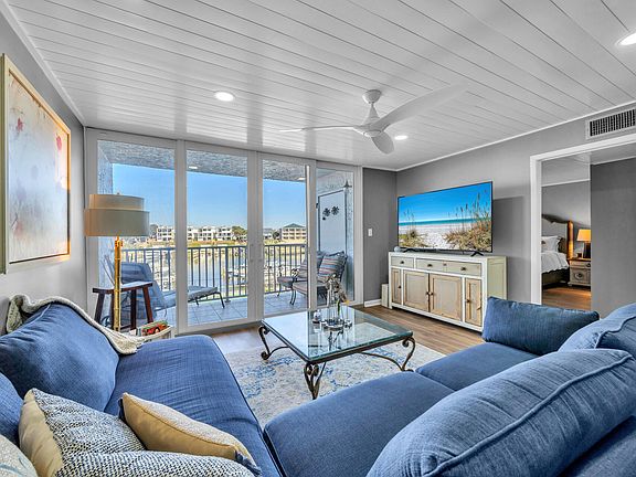 Fantastic 4th floor waterfront condo located on Holiday Isle. Turn-Key vacation rental (sold completely furnished including bicycles and kayak), vacation home or permanent residence. Completely refreshed with unobstructed view of Destin Harbor. Watch the dolphins swim by from your waterfront balcony. This unit is gorgeous, with quality, tasteful furnishings throughout.Ceilings are white shiplap, fresh neutral paint throughout. Premium luxury vinyl flooring throughout - no carpeting! All new Impact Windows and Sliding Doors, HVAC, water heater and garbage disposal. Kitchen has granite countertops, stainless steel appliances, fresh white cabinets and food pantry. Master bedroom with en-suite bath and generous closet. Bathrooms upgraded - tile, showers, vanities. Washer/dryer hook-up. Included is a 15' x 5' storage unit located on the same floor that can be used as owner storage or vacation rental storage. The Dolphin Point community has excellent onsite property management. Amenities include tennis and pickle ball courts (newly updated), pool, club house and marina. Access to the beautiful Gulf of Mexico and private Holiday Isle white sand beaches are at the end of the street. Your condo dues include water, internet and basic cable.