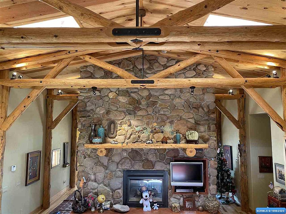 - LIVING ROOM: Blinds, Ceiling Fans, Fireplace, Beamed Ceiling