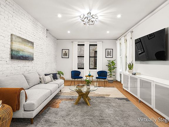 This unique and rarely available two bedroom, two bath co-op, in a coveted Windsor Terrace building, is just a heartbeat from Prospect Park. Renovated in 2018, this chic apartment has many advantages and lots to love! The entry gallery, 19' x 5'7" has a multitude of uses, and leads into a huge and stunning living room with two exposures that face the building's beautifully landscaped back gardens. The living room has an exposed brick wall and recessed lighting, with a boutique chandelier.