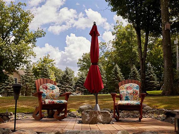 Peace and privacy is found on this property's 2.4 acres, but the abutting 134 acres of Mill Brook Preserve land allows an even deeper escape into nature. The trail system, which can be picked up from the backyard, offers recreation among the old-growth trees, ponds with active beaver lodges, streams, stunning wetlands, and wildlife that call the preserve home. At the same time, Main Street New Paltz's restaurants, shopping, library, etc. are conveniently close, as is the NYS Thruway for travel needs. At the end of a dead-end road, in a residential neighborhood bordering the village, this location truly offers the best of both worlds. The meticulously landscaped property includes a 25' diameter platform deck with a flat-topped rock "table" for drinks (perfect for catching sunsets!) and a huge stone-walled outdoor fire-pit lounge with solar lights and pea-stone pebbles underfoot, mimicking beach sand. Open the front door to a lovely formal entry with elegant staircase, hardwood floors, wainscot paneling, and archways to adjoining rooms. Oversized bay windows let morning sunshine into the dining room and the study, both generously sized. French double pocket doors lead from the study to the living room, which features a cozy Quadra-Fire pellet stove, cultured stone chimney, and handsome stone half-wall. Granite gleams on the counters and large island in the spacious kitchen, which has a double-door pantry, sliding doors to the back deck, and a back hall to the powder room and the two-car garage. Upstairs the grand scale continues with an open, light-filled hall, full bath, and four large bedrooms, one with a dreamy ensuite bathroom complete with a jetted jacuzzi tub, walk-in shower, and skylight. The full basement is unfinished, but boasts almost 8' of height, sliding doors out to the backyard, and over 1,200 square ft. of space for storage, workshop, game room, etc. Live expansively with ease, indoors and out, at 30 Old Mill Road.