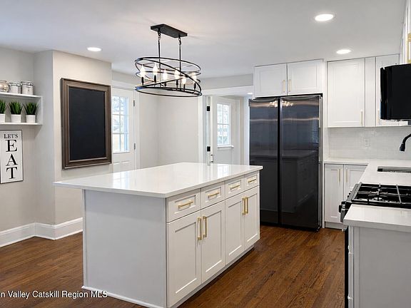 • Renovated kitchen: shaker cabinetry, brass pulls, quartz counters, large island, gas range