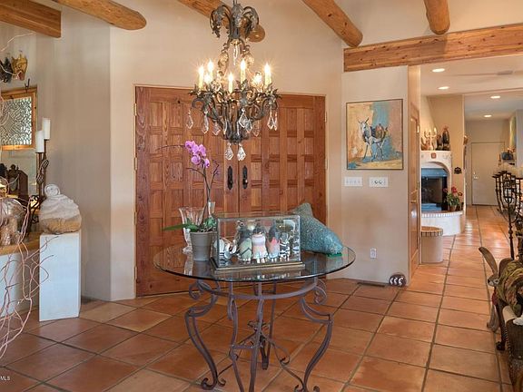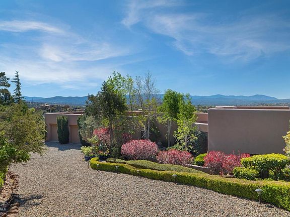 Spectacular single level view home in Yakashba Estates, within minutes of the hospital and shopping, a most desirable location. A sweeping panorama of city lights, skyline and mountain landmarks are enjoyed from this fabulous 3245 square foot, single level Santa Fe Style home. Inviting garden courtyard entry sets the mood with its water fountain. Exuding charm with tasteful appointments throughout, rounded walls, window seats, peel pole accents and extensive Saltillo tile flooring - each room will capture your imagination. Spacious living room has a wet bar with icemaker, raised hearth fireplace, entertainment wall and double doors to a terraced paver patio w/wood burning fireplace,water feature and spa.Master suite includes a garden tub with windows that open onto the rose garden. Kitchen