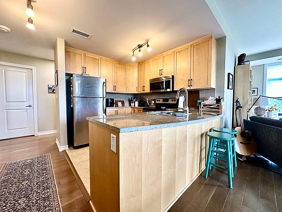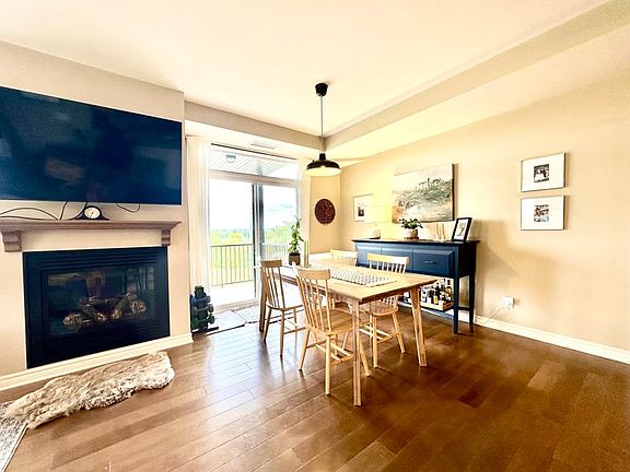 Ottawa, Orleans. This stunning 2 bedroom, 1.5 bathroom, top floor corner Condo in Petrie's Landing is for rent. Available for immediate occupancy! Water is included. It offers an open concept floorplan, 9' ceilings, extra large windows providing plenty of natural light. The living and dining rooms boast a cozy gas fireplace and are ideal for entertaining. The eat-in kitchen is well appointed with stainless steel appliances, granite countertops, breakfast bar and backsplash. Hardwood floors throughout. Two patio doors allow direct access to the oversized balcony perfect for sunset views. The primary bedroom is spacious and features a walk-in closet and large windows. The second bedroom is also a great size. Adjacent to bedrooms is the 4 pce bathroom w/soaker tub and separate shower. In-suite Laundry. Central Air. One exterior parking spot is included. Secure building with front and rear access. Conveniently located in Chatelaine Village within walking distance of bike paths, the Ottawa river and surrounded by nature trails perfect for cross-country skiing. Close proximity to the highway, transit and so much more! **Balcony photo is virtually staged**
