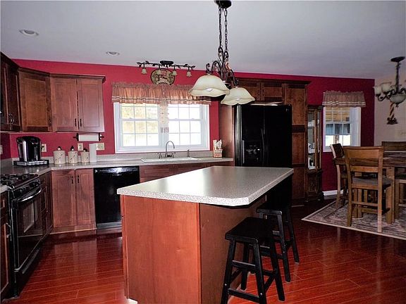 Pristinely maintained Ranch home with gorgeous mahogany kitchen cabinetry and floors through out. Impressive open floor plan with plenty of living area to include fireplaced living room, updated kitchen with center island and dinette area. Owner's suite has plush warm carpet, generous closet and full bath. 1st floor laundry room offers convenience with storage area and deep basin sink. Sun room is an added bonus with carpeted floors, ceiling fan, Newer Hot Tub (warranty) and door leading to backyard. Full basement partially finished & heated with kitchenette, third full bath and large living room area make great rec room or in-law area - walk-out door as well. Paved driveway has turn around, shed stays and additional parking area on west side of home. ADT system (not on), vinyl windows, newer doors and more! 24 hr to show and Must be Pre Approved.