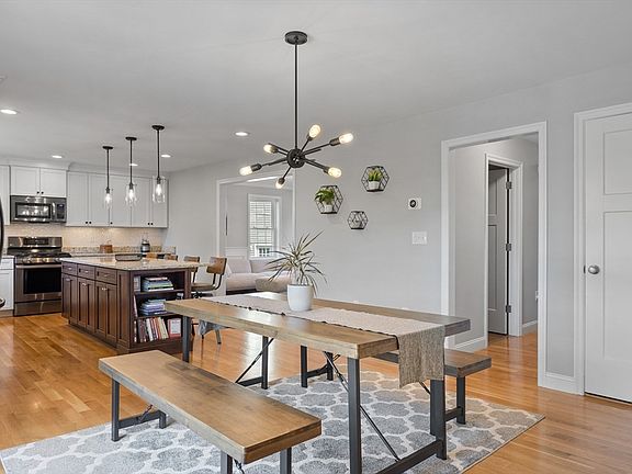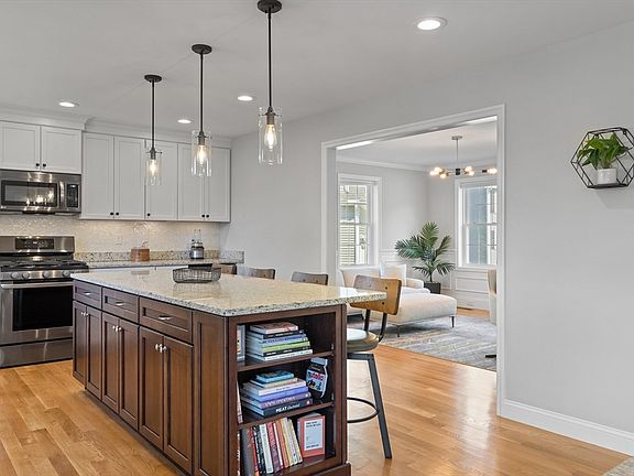 Tucked away on a private cul-de-sac, this gorgeous colonial cues up dove grey siding, timeless shutters, and a stone entry for the quintessence of curb appeal. Completed in 2019, the 4BD, 2.5BA stunner reveals a 2,676-SF interior elevated by glossy hardwoods, crown molding and paneled wainscotting. A colossal island anchors a stunning chef’s kitchen that spills outward into a sunny deck via glass sliders. Appointed with granite counters, S/S appliances and custom fixtures, the kitchen is poised for dinner parties with a sleek wine fridge. Warmed by a gas fireplace, the living room features a bank of walled glass that welcomes sunlight. Upstairs, 3 plushily carpeted bedrooms are joined by a sizable primary suite with walk-in closet and spa-like bath. Ensconced in mature trees, a lush backyard lawn features an herb garden and cozy firepit perfect for alfresco entertainment. Completed by a 2-car garage and unfinished basement, this turnkey home is minutes from local grocers and eateries.