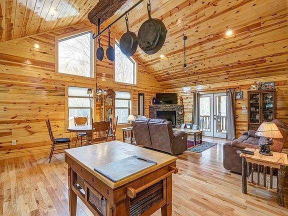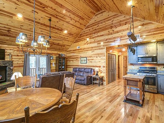 Welcome to your FURNISHED cabin in the woods! Inside, your home features a FULL WOOD INTERIOR for that rustic theme. Your Great Room hosts a vaulted wood ceiling, French door access to your porch, a stacked stone fireplace to warm the chilly mountain evenings. Your kitchen with custom cabinetry, SS appliances, granite and gas range next to your dining area. Down the hall is your laundry area, guest bedroom, guest bathroom with tub/shower & a granite topped vanity. Your Master Ensuite has French door access to your porch, vanity with granite & a stand up shower. Outside is a fire pit area to gather around with friends, a large parking area, all on an almost level lot. Enjoy spending your time on your back porch relaxing and enjoying the sights and sounds of nature!