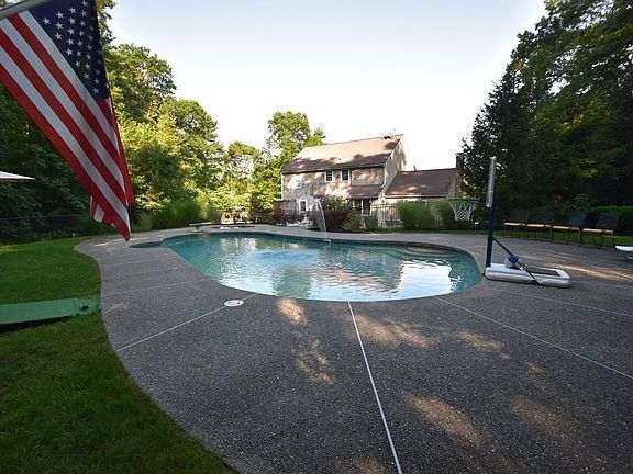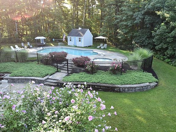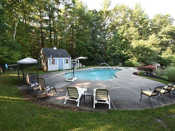 RARE OPPORTUNITY!! Private retreat setting at end of cul-de-sac in desirable Eagle's Nest~backyard oasis is an outdoor enthusiast's dream with large, gunite , in-ground salt water, heated pool with adjacent hot tub and delightful cabana w/refrigerator and island seating~outdoor shower, gorgeous patio areas with fire pit, surrounded by rock wall and meticulously maintained gardens~separate playground area, storage shed and full yard irrigation system~property surrounded by conservation woods~Beautiful home has huge, country kitchen with gleaming HW, granite counters, dual, wall mounted ovens, 6 burner Viking, gas stove, large island w/seating and breakfast nook~sunk- in LR has Pacific Energy wood stove, cathedral ceiling~home office w/HW and glazed French doors for privacy~MBR suite w/large walk-in closet and full bath, plus 3 additional bedrooms and full bath~Finished LL has tiled floor,built in sitting nook~whole- house generator~Minutes to Route 3 and close to T~Stunning home!