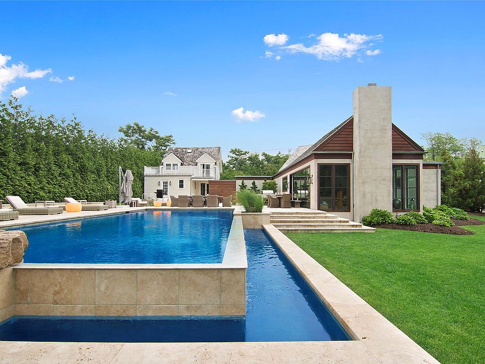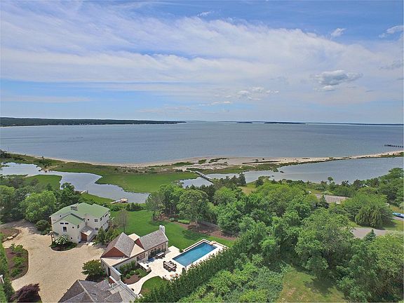 Just moments from Long Beach, this Sag Harbor gated waterfront compound offers spectacular sunsets and unobstructed views of Noyac Bay, Shelter Island and the North Fork. Situated on 1.2 acres, the property is comprised of two separate parcels and includes a Main House, Guest House and Pool House/Garage. The main house boasts 4 bedrooms, 3.5 baths and 2 separate living areas. The breathtaking views are maximized with a second floor living room with cathedral ceiling, floor-to-ceiling windows and attached deck. A sleek, white kitchen contrasts beautifully with dark wood floors.The water views are equally stunning from the 3 bedroom, 3 bath private guest house. The centerpiece of the stylish glass enclosed pool house is a living room with cathedral ceiling, timber beams and a fireplace flanked by expansive windows with chef's kitchen. Just outside is the infinity pool, sauna, outdoor shower, built-in bbq,two car heated garage and dock complete the picture and lend themselves perfectly