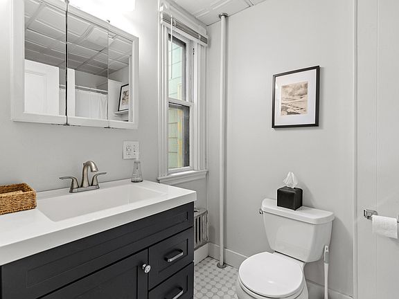 Renovated in 2021/2022, the condo combines sleek, contemporary finishes with the timeless character of an early 1900s home. Hardwood floors, large windows, and an abundance of natural light create an inviting atmosphere throughout. The modern kitchen features stainless steel appliances, quartz countertops, ample cabinet space, and a convenient pantry. A thoughtful layout includes bar seating, a cozy dining nook, and a versatile adjoining space perfect for a formal dining room, home office, or additional lounge area.