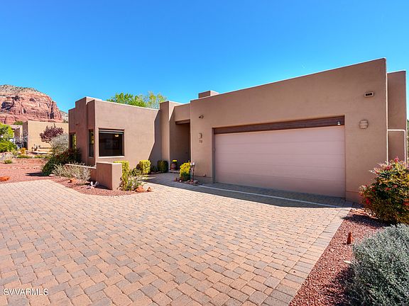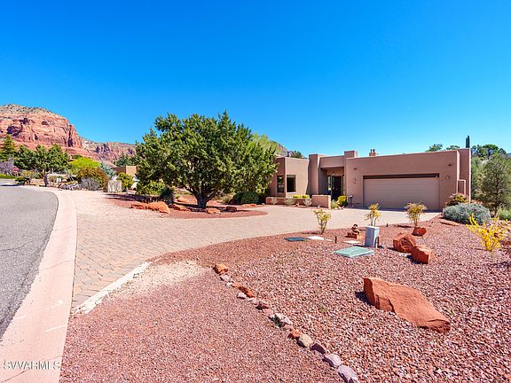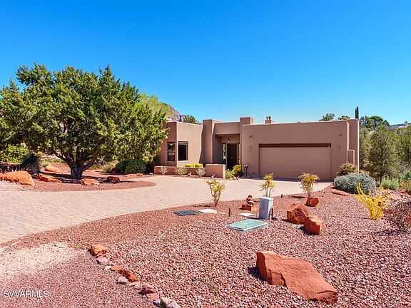 Welcome to a highly crafted home designed by Paul Overman and built by Casa Natural Builders. This charming southwest contemporary home has many upgrades complete with porcelain floors, cherry wood entertainment bar with red rocks views, alder wood doors, matching stained wood ceiling accents, numerous art niches, stacked stone fireplace, built-in barbecue grill next to kitchen, granite countertops, alder wood cabinetry, and gas cook top. The backyard offers multiple patio sitting areas with red rock views. The 58' long patio is complemented with a trickling waterfall feature creating a peaceful place to enjoy your mornings or evening sunsets while listening to flowing water. Numerous windows throughout the home give direct views of well known red rock formations to enjoy the changing colors of Sedona's Red Rock sunsets. Many well-known hiking trailheads are within walking distance from the home to ensure the Sedona lifestyle. The garage is complete with storage cabinets, wash sink, and shelving. Underneath the home in the crawl space, you will find an additional large storage space or workshop/hobby room for the creative person. Laundry room includes LG washer and LG steam dryer and wash sink. The split bedroom floor plan gives good space and privacy between bedrooms and the open living space design is perfect for entertaining guests. The flow between indoor and outdoor living spaces is done to the highest of levels and truly brings the Sedona magic into this home! Don't miss your opportunity to own this highly crafted, well-maintained home!