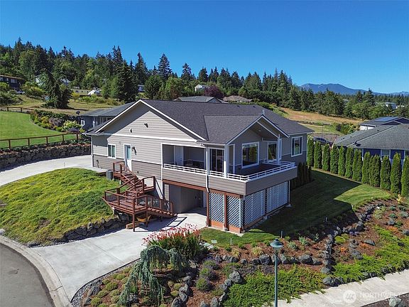 Enjoy sweeping views of Sequim, the Strait, and the lighthouse from inside the home and the spacious Trex-decked balcony. The open-concept great room features vaulted ceilings, large picture windows, and a gas fireplace that operates during power outages. The chef’s kitchen offers quartz counters, Samsung stainless appliances, and a large island. Bathrooms include tiled showers, LED-lit mirrors, and quartz or marble vanities. Additional highlights include solid-core flooring, 8' doors, a central vac system, EV-ready garage with epoxy floor, and a heated lower-level shop with power and half bath. Built to withstand 130 mph winds, with a 500-gallon buried propane tank.