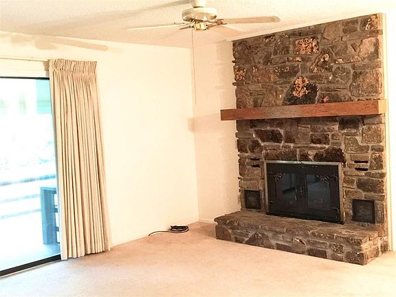 SUPER ONE LEVEL TOWNHOUSE WITH FIREPLACE -also RAMP to front door- Newly painted inside and out- Approx 1100 sq ft heated and cooled. 2 bedrooms 1 1/2 baths & located in great spot. Features nice open living-dining room with lovely native stone fireplace & goes out to nice COVERED BACK DECK viewing green space. There is a large storage area or WORKSHOP AREA under townhouse which is accessed from outside-