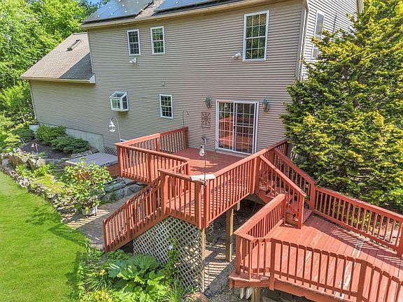 This charming colonial style home is perched in a desirable neighborhood on a cul-de-sac with a beautiful view. This home features a open-concept living with family-friendly layout, a master bedroom suite with walk-in closet and room to expand with a finished bonus room that could be used as office space, as well as extra storage. An updated kitchen with all stainless appliances, ample cabinets and pantry, soapstone countertops, and a granite-topped center island. The large living area provides ample room for entertaining. Sliding doors lead to an expansive multilevel deck to stone patios and the private backyard with fire ring & elevated spa. Lush perennial gardens with fruit trees, berry patches, and grapevines! The finished, walk-out basement with French doors complete the properties ample living space. Pellet stove and homeowner owned solar panels provide environmentally-friendly heat and electricity (imagine no electric bills!) Custom, heavy-duty storage shelves in garage.