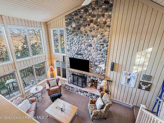 Walk to the Slopes in the Winter and Listen to the Soothing Sounds of the Cascading Waterfall from the Primary Ensuite in The Spring & Summer! Escape to Luxury in the Catskill Mountains - Your Dream Ski Chalet Awaits! Step into the extraordinary at this stunning ski chalet a short distance from the slopes at the Windham Mountain Resort! Perfect for city escapes or quality time with loved ones, this luxurious retreat is designed to help you unwind, reconnect, and create unforgettable memories. Unmatched Mountain Ambiance: This tri-level chalet offers warm wood interiors, soaring vaulted ceilings, and glowing fireplaces, creating the ultimate mountain vibe. The great room, with its dramatic vaulted ceilings, two-story wall of glass, and wood-burning fireplace, is a showstopper that brings everyone together with breathtaking Catskill Mountain views. A Chef's Dream & Ample Space: The high-end kitchen features stainless steel appliances, including a Wolf stove, and an open concept that blends seamlessly with the living space. With four-five bedrooms and four bathrooms, there's room for everyone to enjoy privacy and comfort. Two ensuites elevate luxury living. A primary ensuite on the top floor with sweeping mountain views and another on the lower level, perfect for hosting guests. A flexible loft space is ideal for a home office or a gym. A Mountain Paradise & Cozy Retreat: This chalet was made for mountain enthusiasts. A heated equipment room keeps your gear dry and ready for the next adventure. After a day on the mountain, either head to the hot tub for a soak or to the family room, where a wet bar with a second fireplace awaits the perfect spot to gather for cocktails. Share stories, laugh, and make memories that will last a lifetime. Perfectly Located: The paved driveway accommodates four or more cars, and Windham's charming shops, dining, and activities are just minutes away. The Ultimate Getaway: This chalet is more than a home; it's your personal escape. Whether savoring the mountain, relaxing by the fire, or enjoying a drink at the wet bar, every moment feels special. Use it as your private retreat or take advantage of its incredible rental potential. Your Catskill adventure starts now. Don't wait, reach out today and make this dream getaway yours! A 3D Walkthrough Tour is available in the digital Lookbook or by request from the listing agent.