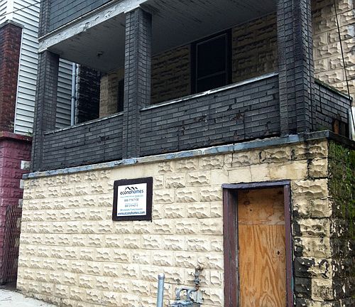 Exterior Features:Hillside property in overall poor condition with asphalt siding and roof. Front porches on the second and third floors. Interior Features:Interior is in overall poor condition with carpeting throughout aside from in the kitchen and bathrooms which have vinyl flooring. Some windows are boarded up. All mechanics are in the unfinished basement.
