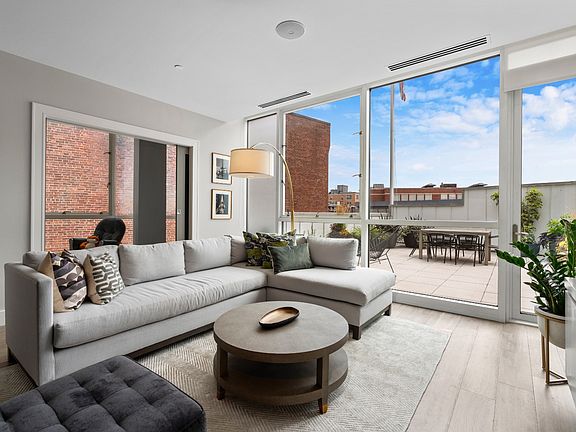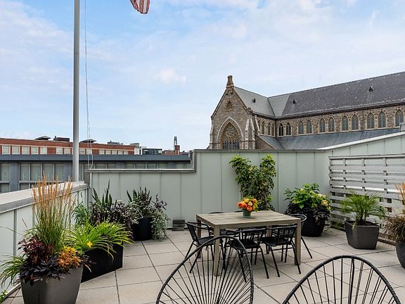 Stunning two bedroom residence at the Penny Savings Bank building offers a gracious entry foyer, a chef's kitchen with high end stainless appliances, gas cooking and excellent counter and cabinet space. The contemporary and dramatic living area features high ceilings, newly renovated flooring and a gorgeous view of the spacious outside landscaped terrace from beyond a wall of glass. With southern and western exposure this is a very sunny home! The luxurious primary bedroom suite offers generous closet space and a spa-like bath with double vanity. A second bedroom (presently used as a nursery) and a full bath are nicely separated off the living area. The elevator building offers a common roof deck with panoramic city views, well-run professionally managed association, recently updated hallways and lobby, and high owner occupancy. If you are looking for a home with a "wow" factor, this is it! A row (2 garage spaces) can be conveyed, with seller to pay rental for 1st year.