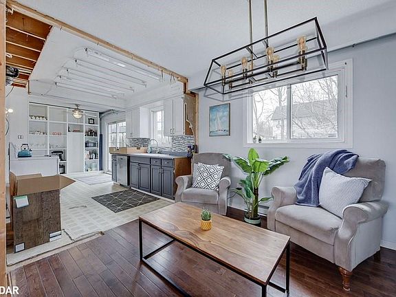 Opportunity to realize the potential of this 2 storey home in desirable east end of Barrie. Recently installed central heating opened up the ceilings and wall on part of the main floor. Professional plans for main floor renovation drawn up by Madison Taylor Design with permit pending. Optional plan also available for legal basement second suite. Current cozy family room with wood stove and walk out to deck. Rough in for bathrooms on main floor and in the basement. 790 square feet of brushed oak engineered hardwood. Includes brand new 36" stainless steel refrigerator, Thermador induction cooktop and large convection oven. Upstairs primary bedroom with walk in closet and 2pc ensuite. Second floor also features 3 additional rooms and 4pc bath. Double garage and curb appeal. Fully fenced backyard with deck and walking distance to Johnson's Beach. Quick closing possible.