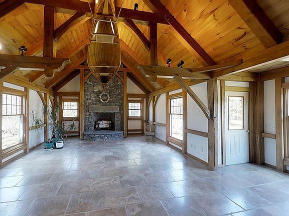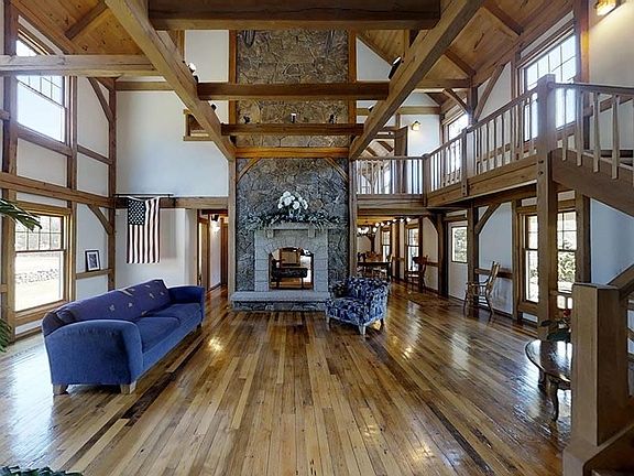 - RoomLivingRoomFeatures: Living Room, Wood Burning, Recessed Lighting, Cathedral Ceiling(s), Beamed Ceilings, Reclaimed Wood, Shared Half Bath