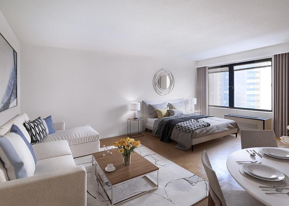 Low floor studio apartment with classic kitchen, lots of closet space and private dressing area, and north views of the East River and city. 497 sq ft.Two-acred landscaped plaza w/ river and city views, year-round activities schedule, playgrounds, on-site preschool, free Wi-Fi, sundeck, restaurant/lounge on site, groceries, banking, dry cleaning, shopping on-site