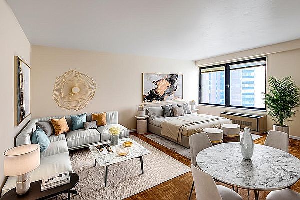 Mid floor studio apartment with classic kitchen, ample storage space, private dressing area, and south views of the plaza and river. 497 sq ft. Available 9/20.Currently offering one month free and one month OP. The rent shown is the Net Effective Rent, with 1 month free on a 12 month lease, given at the beginning of Lease. Tenant will pay the Gross Rent for the remaining months. Two-acred landscaped plaza w/ river and city views, year-round activities schedule, playgrounds, on-site preschool, free Wi-Fi, sundeck, restaurant/lounge on site, groceries, banking, dry cleaning, shopping on-site