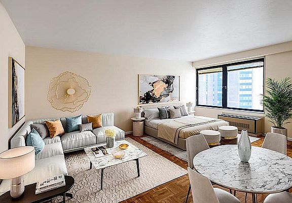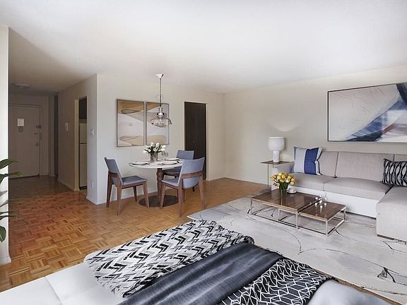 High floor studio apartment with classic kitchen, ample storage space, private dressing area, and southerly views to the plaza and river. 497 sq ft. Available now.Currently offering one month free. The rent shown is the Net Effective Rent, with 1 month free on a 12 month lease, given at the beginning of Lease. Tenant will pay the Gross Rent for the remaining months. Two-acred landscaped plaza w/ river and city views, year-round activities schedule, playgrounds, on-site preschool, free Wi-Fi, sundeck, restaurant/lounge on site, groceries, banking, dry cleaning, shopping on-site