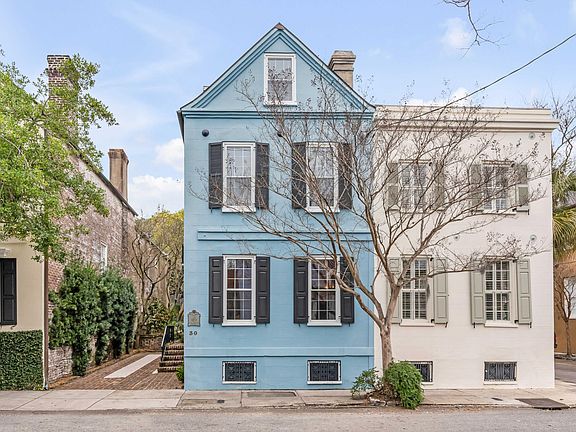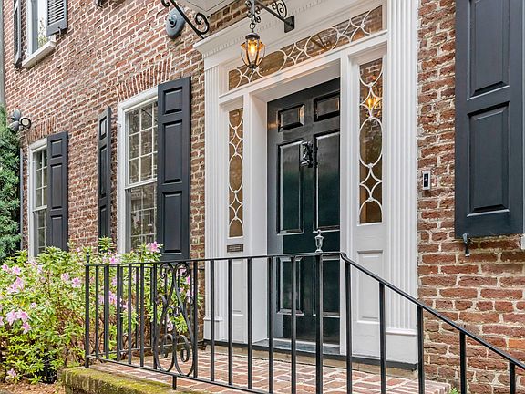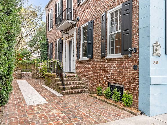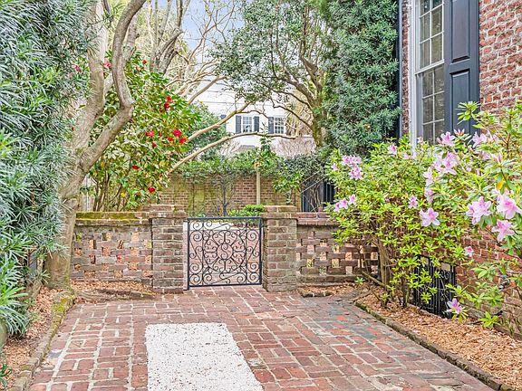This 1843 historical gem has all of the components of an elegant and Handsome Charleston Single home. The generously sized Living Room and Dining Room are located off a charming foyer and both rooms boast beautiful built-in shelves and handsome fireplace mantels. Many of the historical details remain such as original wooden floors, mantels, moldings, doors, and original plaster ceiling medallions. The charming and updated kitchen has a painted decorative wooden floor and generous storage space. There is a laundry room with a pantry and additional storage on the main floor. The second floor has the original drawing room with a fireplace and bookcases. This sun-filled room could be a beautiful formal space, library, or bedroom. The principal ensuite bedroom is generous in size and the largebath has been beautifully and recently renovated. Two additional bedrooms with a shared bath are located on the third floor. The garden behind the 'Phillip Simons" gate is elegant and formal with tasteful storage facilities for storage and rubbish. The bricked parking courtyard can be used in tandem with the garden for entertaining or ample parking. This handsome masonry home has a historic facade easement held by the Historic Charleston Foundation This property has never flooded and is located in an elevated flood zone.
