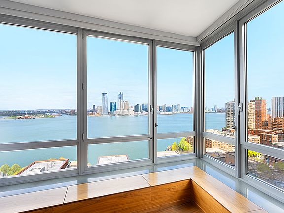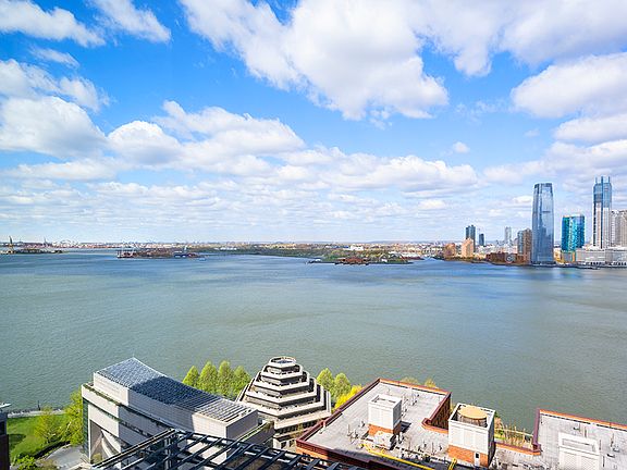 Welcome home to this spacious 5-bedroom, 5.5-bathroom condo with panoramic river and city views that feature the Statue of Liberty, Hudson River, and One World Trade. The living room includes breathtaking views and custom seating along the windowsill, perfect for taking in cinematic sunsets, and an expansive wet bar makes entertaining a breeze. The chef's kitchen, which is open to the family room, boasts a private balcony and is appointed with top-of-the line appliances, including a Sub-Zero refrigerator, Miele dishwasher, Viking gas range, and U-line wine cooler. The spacious primary bedroom has direct river views, en-suite bathroom with a double vanity, soaking tub and frameless glass shower, and a walk-in closet. Four additional bedrooms each have en-suite bathrooms. Other apartment features include an in-unit washer/dryer, Brazilian cherry wood flooring, and an entry with custom built-ins for coats and shoes.