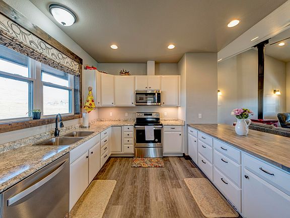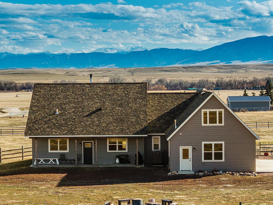 Introducing an idyllic retreat. A modern farmhouse nestled on 5 acres with coveted water rights. This picturesque property boasts a 36 x 40 barn perfect for storing equipment or indulging in equestrian pursuits. Delight in the bounty of strawberries and raspberries this summer. This property offers a quintessential blend of modern amenities and rural charm. Step inside the 2264 sq. ft. home where a thoughtfully designed open floor plan invites entertaining while offering majestic mountain views that paint the horizon. Retreat to the owner suite for a luxurious soaker tub, shower and 2 walk-in closets. 3 heating sources; wood, propane, heat pump