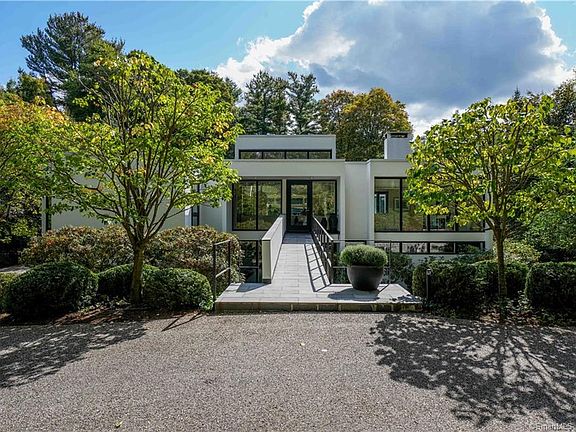 Stunning Sunset Farms contemporary oasis on a private cul de sac! Designed by preeminent local architect Tai Soo Kim, this 4 bed 4 .2 bath home is an architectural masterpiece that seamlessly blends indoor and outdoor living with modern design. Upon entry you're greeted by an expansive open concept living and dining room space with lofted ceilings, hardwood floors, and views through to the back of the home and central courtyard. Built for entertaining, the living room has a built-in wet bar that can be either opened or concealed in the wall paneling. The gourmet kitchen boasts top of the line appliances, quartz countertops, and a breakfast peninsula, which blends into the cozy family room complete with gas fireplace. Simply open the floor to ceiling sliders in the garden room off the kitchen to merge the indoor/outdoor entertaining spaces. Enjoy al fresco dining on the bluestone patio and summers lounging at the incredible in-ground pool! Completing the main level is a dream master suite, complete with dual walk-in closets and bathrooms! You'll feel like you're in a spa with separate full bathrooms that connect with an oversized shower at the center! On the lower level you'll find the remaining four bedrooms including a dedicated office space, along with a spacious sitting room as well as access to storage space and the 2-car garage. Backing to the West Hartford Reservoir and only 2 miles to West Hartford Center, this home is an architectural treasure not to be missed!