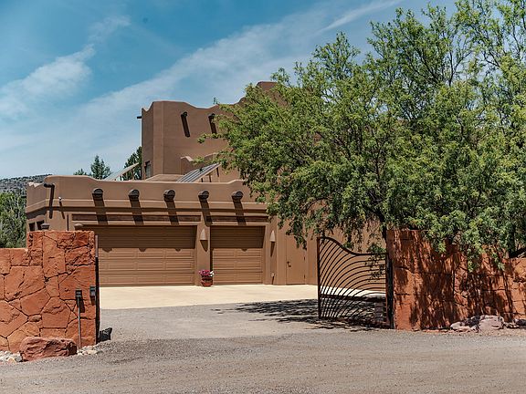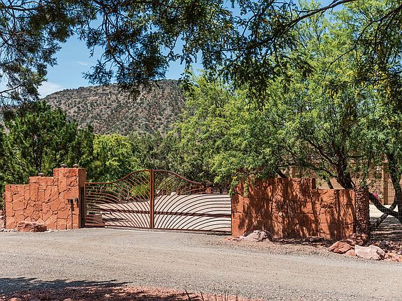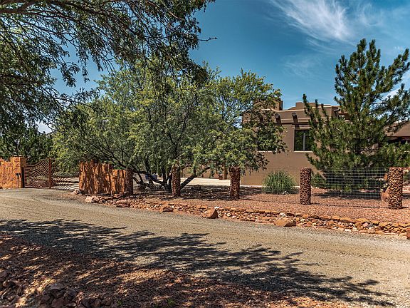 RETREAT TO YOUR PRIVATE OASIS in this Custom Santa Fe style home, designed for livability, functionality and energy efficiency! Nestled between trees on a sprawling fully fenced .81 acre with remote gated entrance, near National Forest. Perfect entertaining house features central spacious gourmet kitchen flowing to dining and living areas for entertaining inside, and an impressive private north facing portico with red rock fire pit for outdoor entertaining. The split bedroom plan affords separateness from you and your overnight guests. Upstairs private 2nd master bedroom suite and viewing deck, accessed by both elevator and gallery inspired staircase, captures awe-inspiring red rock views, spectacular sunsets, and starry night skies. Ideal primary home and vacation home. Impeccably maintained and move-in ready, no expense was spared in the construction of this fine residence. Ideal north-south orientation, Green ICF construction, 15 solar panels owned, elevator in garage to access main living level plus upper level viewing deck and guest bedroom suite. SpacePak connected to HVAC and whole house recirculating fan, radiant floor heat in four zones, Pella windows and sliding doors, two water heaters, three fireplaces plus red rock fire pit, three car garage, expansive guest parking, front and rear porticos, grand barrel ceiling entry with galleria, gourmet kitchen featuring upgraded appliances, double ovens, warming drawer, copper sinks, and knotty alder cabinetry, solid alder arched doors, soaring ceilings, central vacuum, whole house sound system, upper viewing deck, elevator access for garage, main level and upper level, plumbed for a future pool and hot tub and so much more. One bedroom on main level features private patio access and currently purposed as an office. Convenient to hiking and biking trails, golf, tennis, fitness centers, fine and casual dining, grocery, banks, professional and retail services. For a comprehensive list of Special Features, Amenities and Recent Improvements, and to arrange a private viewing, please contact Listing Agent, Lynne Easterday, 928-301-3180.