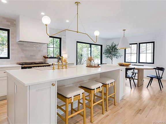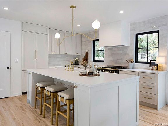 This 4BR turn-key property sits in the heart of Greenwich in the prestigious private gated association of Milbrook. From the minute you walk into the tall glass entryway, you will feel a sense of calm in this amazing professionally designed home. Fully renovated with a new roof, Marvin windows, Hardie siding, refinished floors, and remodeled kitchen and bathrooms, it features a neutral pallet with clean lines and sophisticated style. Relax in the formal living room alongside the gas fireplace and bask in amazing natural light with full views of the beautiful open-plan kitchen and dining area. The kitchen offers a coveted Ilve Italian custom stove, quartz countertops and large island making it a dream kitchen to entertain in. The dining area is open to the kitchen for easy flow, with sliding glass doors to the backyard for indoor-outdoor living and entertaining. The family room is a spacious and relaxing space with plenty of room to unwind and has direct backyard access via patio doors, as well as a double barn door entry to an oversized home office/homework station/library. Three spacious bedrooms anchored by a large full bath with a multi-faucet vintage trough sink provides an exquisite bathroom that children and guests will love. The spacious and lavish master suite offers a relaxing retreat with his/hers closets, cathedral ceilings and large master bathroom with marble floors, soaking tub, double vanity and rain-head shower fixture.