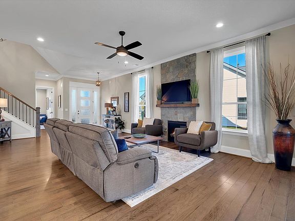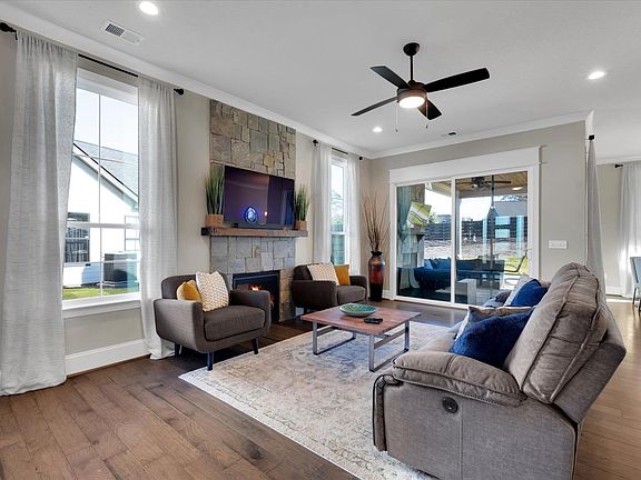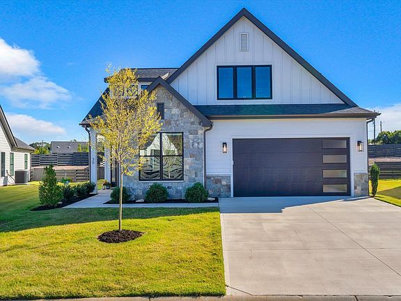 This stunning custom home is located in the highly desirable South Pointe Cottages neighborhood. It features four bedrooms and three full bathrooms, along with an attached two-car garage, making it the perfect home. Upon entering, you are greeted by spacious, open areas, vaulted ceilings, and a stone fireplace in the living room. The chef's kitchen boasts a gorgeous waterfall island and plenty of storage, accompanied by a large dining nook that overlooks the covered patio. The patio is equipped with an outdoor fireplace and a beautifully landscaped, fenced backyard. Lawn maintenance is included! The primary suite is conveniently situated on the main floor, offering soft carpet and tall windows that create a serene atmosphere. As you enter the attached en suite through a custom barn door, you'll find beautiful tile work, a dual vanity, a large walk-in shower, and a roomy soaking tub. The second bedroom on the main level can be used as an office, den or guest room. Upstairs, there are two sizable bedrooms, the third and fourth, which share an en suite bathroom. Additionally, there is a loft area that provides extra space for relaxation or entertainment.