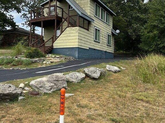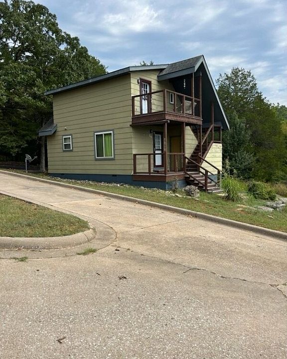 Adorable asymmetrical house is divided into two rentals. one up and one down. Upper unit is a tad smaller. Each is a studio apartment, with built in tiny kitchen, bath etc. Upper level has balcony, lower unit has porch. Each has long term tenants. Nearby is the Marina on Table Rock Lake, further along the road is the community pool, 9 hole golf course, tennis courts, softball diamond, & pavillion for gatherings with big barbecue grill. 18 hole golf at top of hill. Eureka Springs is about 5 mi. in the other direction !
