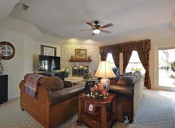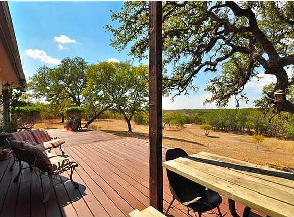 Great price in wonderful Saddletree Ranch! Gorgeous, spacious home on a lovely, private 2.89 acre lot, partially fenced with over 300 oak trees. Home features beautiful hardwood & stained concrete floors, designer colors, 3 bedrooms down, master retreat upstairs w/balcony and views, 2 living areas, great storage. Huge party deck and brick fireplace perfect for cookouts, sunsets and stunning views. Fabulous new horse facilities: 3 horse barn, tack room, storage shed. 4 horses allowed. Hurry!