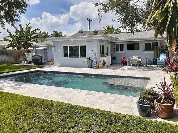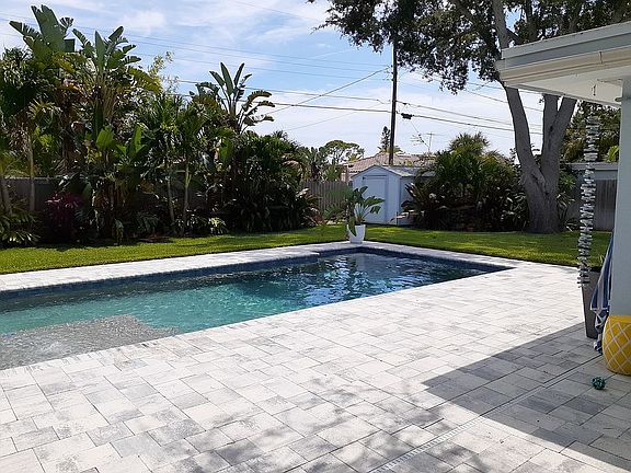 Solidly built concrete block bungalow home just a quick walk to beautiful St. Pete Beach and across the street from some Amazing Waterfront homes. The home has been fully updated with a new kitchen and appliances. Two completely new full bathrooms and a new pool bath. New pool built in 2019 with large paver area. This home has a covered front porch where the owner used to have a waterfront view!) New high quality waterproof vinyl flooring just installed. Single car garage with new garage door. Complete new central heat and air installed in 2010. New shingle roof in 2015. Beautiful yard with lots of foliage and palm trees. It's the best looking house on the block.