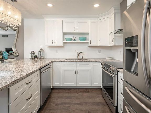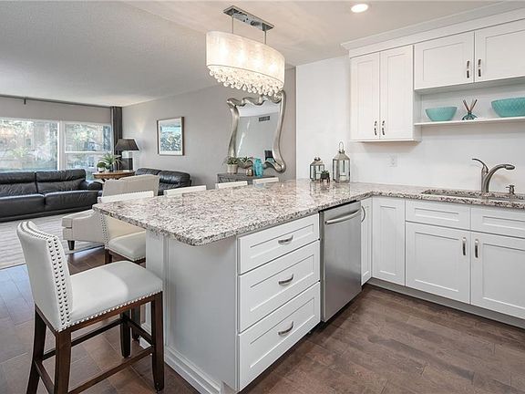 Located just across the beautiful sandy beaches of St. Pete with resort style amenities. Newly remodeled w/over $55K in upgrades make this a gorgeous one-of-a-kind remodel. Upgrades include gourmet kitchen w/all new SS appliances, granite countertops that extends to double as dining table, new wood floors thru-out, marble shower, high hat chandelier, guest and master bedroom have barn style door entry. New double pane hurricane windows, new A/C, NEW EVERYTHING! Unit has huge 12foot picture window overlooking community pool w/lush tropical landscape and Boca Ciega Intracoastal. Occupancy 4 person. HOA Required. MUST see this one! You will not be disappointed.