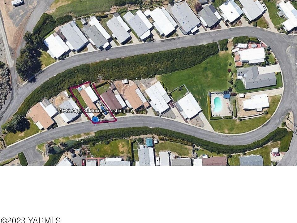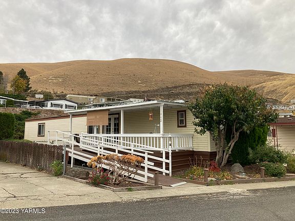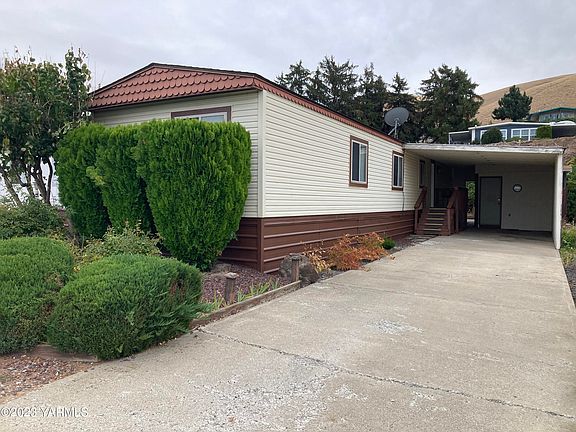 Well maintained home in a 55+ neighborhood overlooking the Yakima Valley. Beautiful views of city lights and surrounding hills. Two plus bedrooms with an open kitchen/dining/living space. Fenced yard with storage shed and carport. Community pool and well maintained roads. Community allows pets.