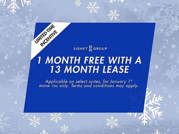 - Special offer! Limited Time Offer: Get 1 Month Free with a 13 Month Lease, for January 1st move-ins only. - *Offer valid on select suites. Additional terms and conditions may apply.