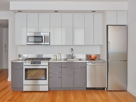 Bright, west facing studio, features white oak hardwood floors, Bosch washer/dryer, stainless steel Bosch kitchen appliances, stainless steel countertops, custom closet shelving and finishes, solar shades throughout apartment, in-sink garbage disposals, Hans Grohe bathroom fixtures, keyless electronic apartment access, LED energy efficient track lighting, Corian windowsills & large ceiling-height.