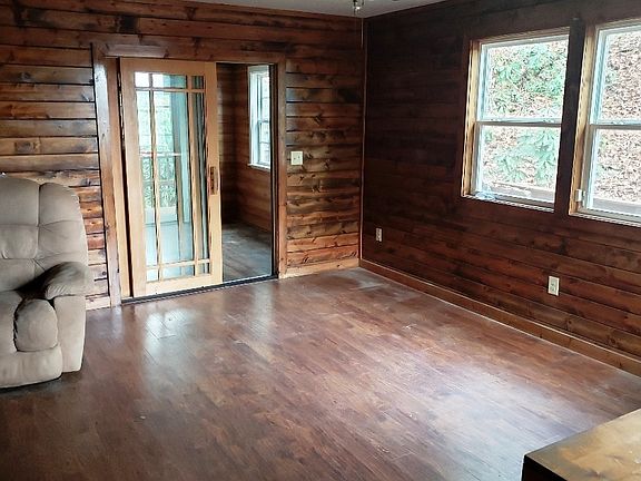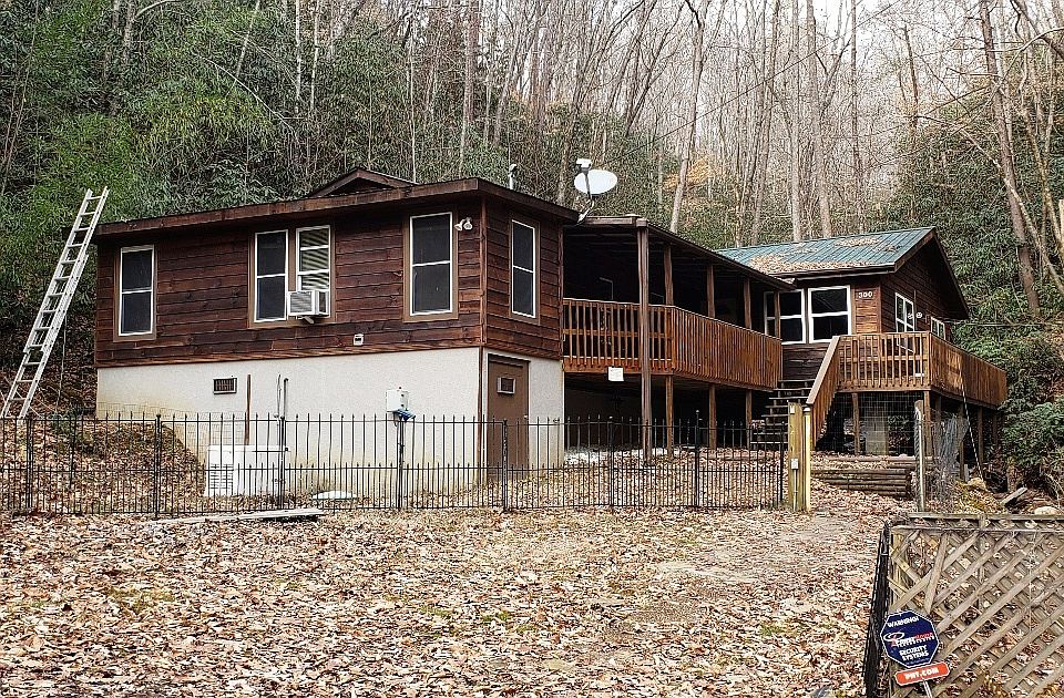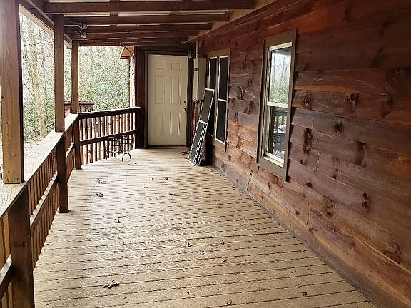 Project house: 2/2 Cabin style home with wrap around porch in good to fair shape inside. Situated on 2 lots totaling 6 acres. Creek comes down mountain behind house and goes under porch. Last July 2022 a storm took down some trees that washed under home and took out some of the foundation piers, which now need to be rebuilt. Inside needs some updating but is very livable when building department says foundation is ok. Only appliance is a dishwasher. Priced to sell AS IS. Septic is a pump system, Private well, Generac all house Generator included. Shed included.