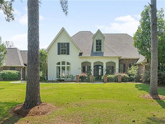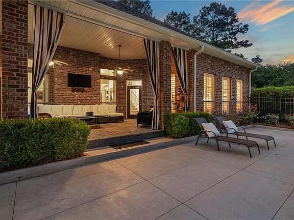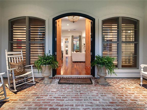 Nestled amidst the pine trees and old oak trees, this stunning 4 bedroom, 4 bath home exudes elegance and modern comfort and sits on 1.10 acres. Its quaint exterior features a blend of brick and stucco accents, complemented by a lighted garden and a welcoming front porch featuring gas lanterns.