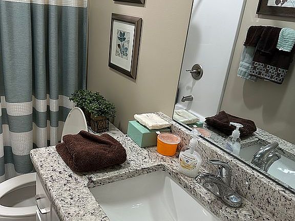 Our home is built with an open floorplan.This makes dining and family area very accessible. New white cabinets in kitchen and bathrooms as well as new blinds. Rooms are bright and quite large. The covered porches make being outside a joy.