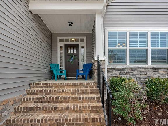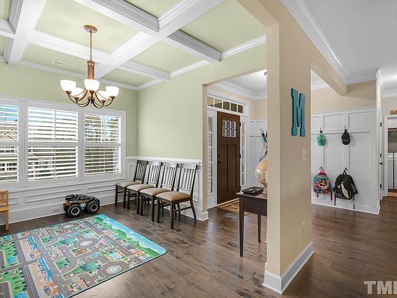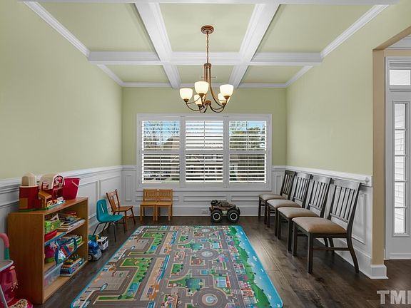 This Caviness & Cates corner lot home features 5 bedroom, 3.5 bath home with bonus room. Large open kitchen w/island, SS appliances, granite counters. Open concept plan w/formal dining room w/coffered ceiling. Crown molding, plantation shutters in kitchen, living room & dining room. First floor master bedroom!! Screened in porch & fenced in back yard. Enjoy neighborhood amenities such as shops, walking trails, on-site schools, athletic club & golf. 20 min to Raleigh.