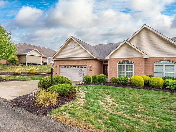 Easy living in this 2-bed, 2-full bath TH located in Brick Ridge Estates, Washington, PA. A level drive leads to a 2-car garage and a walkway guides guests to the covered front entry. Inside, a spacious, bright foyer provides garage access, coat closet, and full bath. Bedrm 2 is off the foyer with front-facing windows and easy access to the full bath. The open concept kitchen, dining, living area is dreamy with vaulted ceiling and abundant natural light. The equipped KIT features ample prep & storage space including a full pantry, island w/seating, stainless appliances, and sightlines to the dining & living rms beyond. Sliders from the dining rm lead to the rear patio with views of a serene fountain and pond. On the other side of the home, you will find a luxurious owner’s suite with rear-facing windows, tray ceiling with recessed lights, walk-in closet, sizable ensuite with dual vanity, large step-in shower, and storage. A separate laundry rm is nicely tucked away behind closed doors.