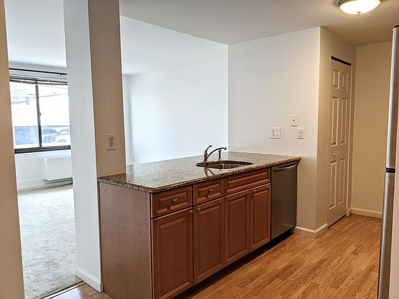 Luxury one bedroom in modern high rise in the heart of downtown! Gourmet eat in kitchen w/ granite countertops, high end cabinetry, stainless steel appliances- stove, dishwasher, microwave, breakfast bar that opens into sunfilled living/dining area w/ walls of glass, great views! Large bedroom w/ lots of closets, updated bathroom, air conditioning, reserved garage parking space, gym, walk to train, shops, nightlife, minutes to highways and beaches! Owner pays for water and garage parking.