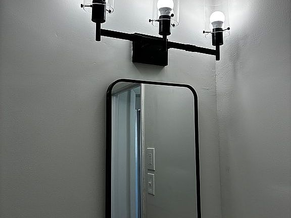 • Bathroom features ceramic & subway tiles, sleek white vanity, bold black accents